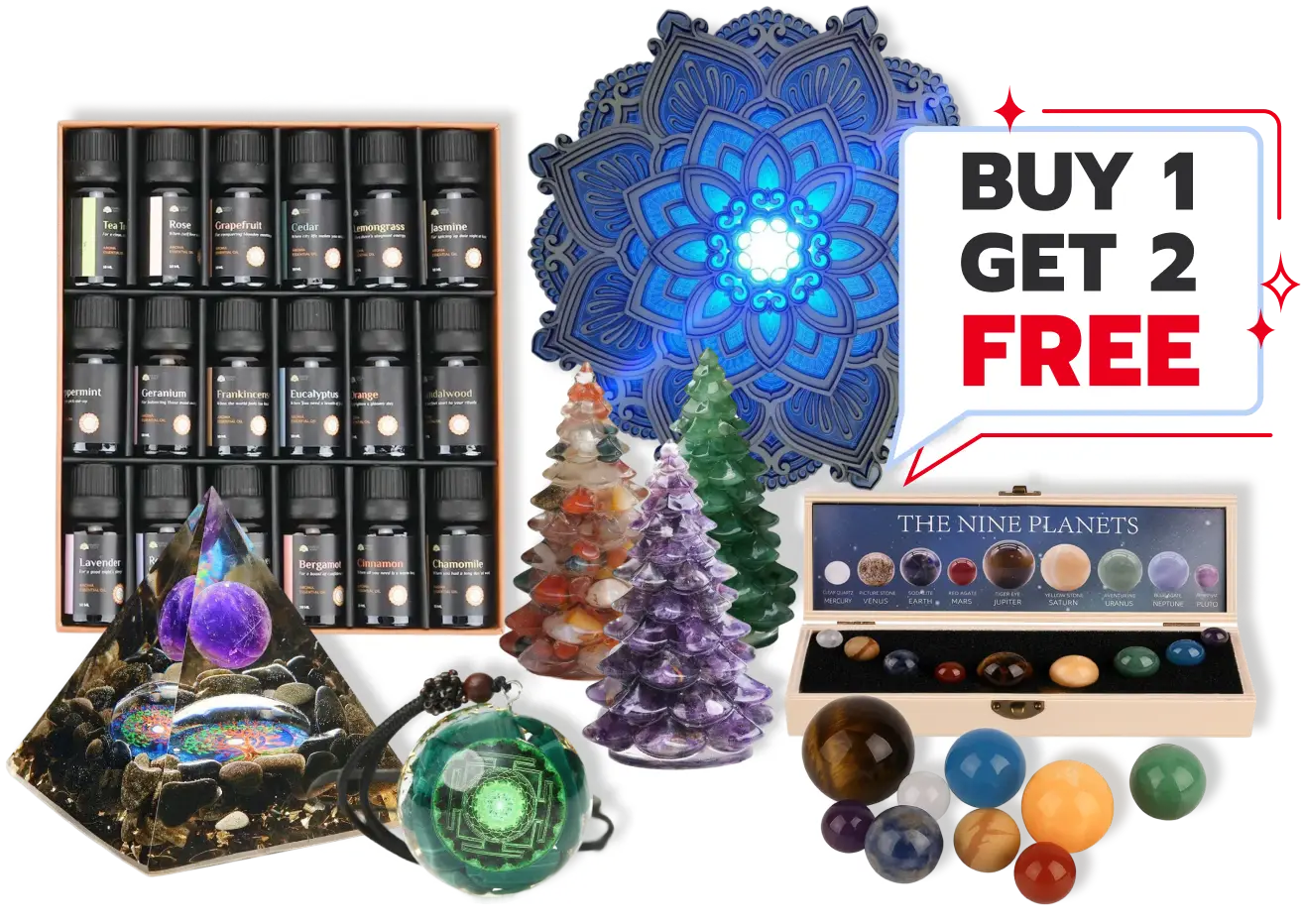 Light up your season: Purchase the Mandala Lotus Lamp and enjoy a Natural Gemstone Christmas Tree plus Crystal Santa Night Light for free!