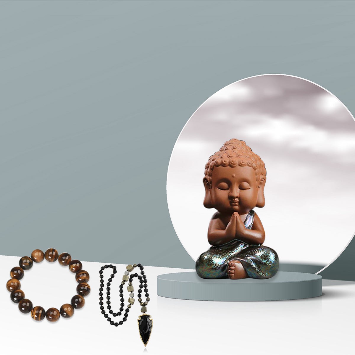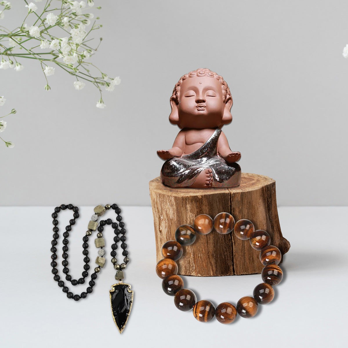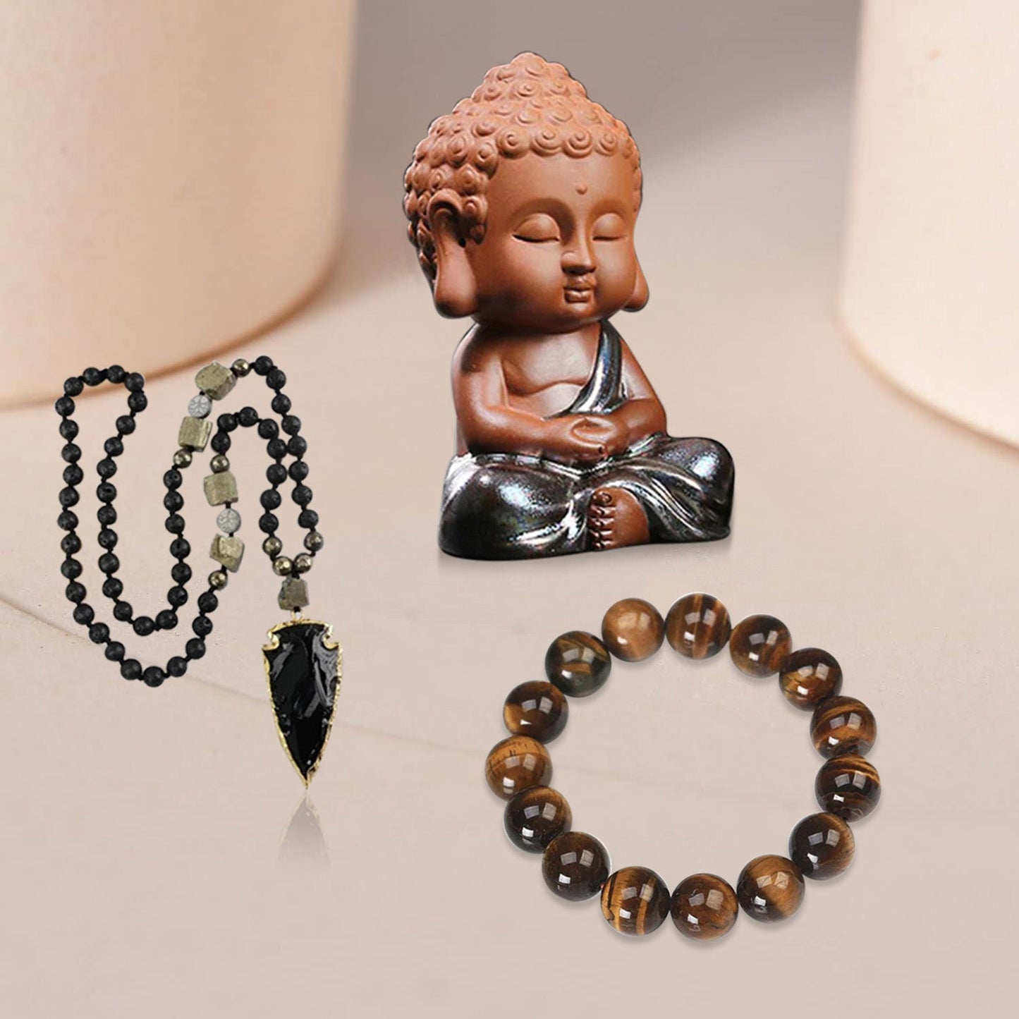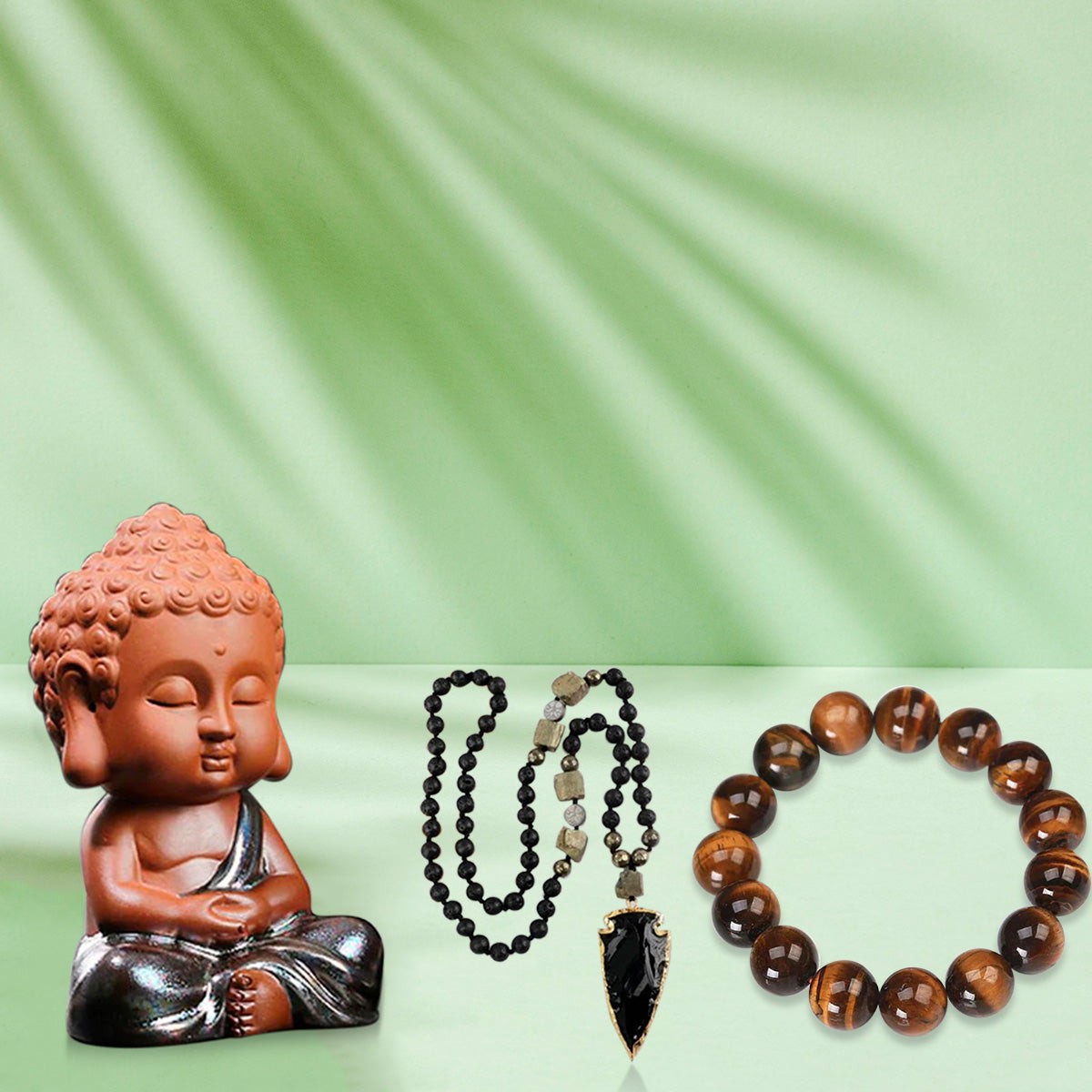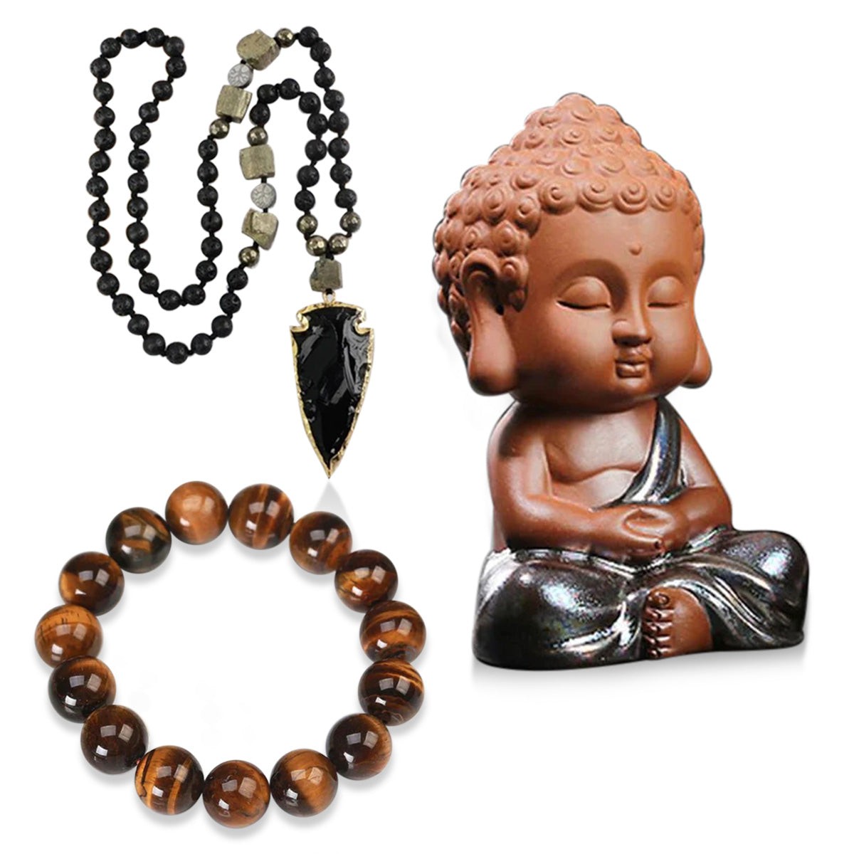 Bundle includes: Tiger's eye bead bracelet, buddha figurine, black obsidian necklace.