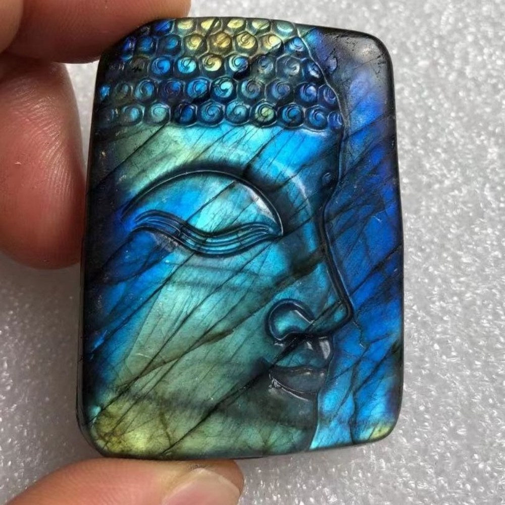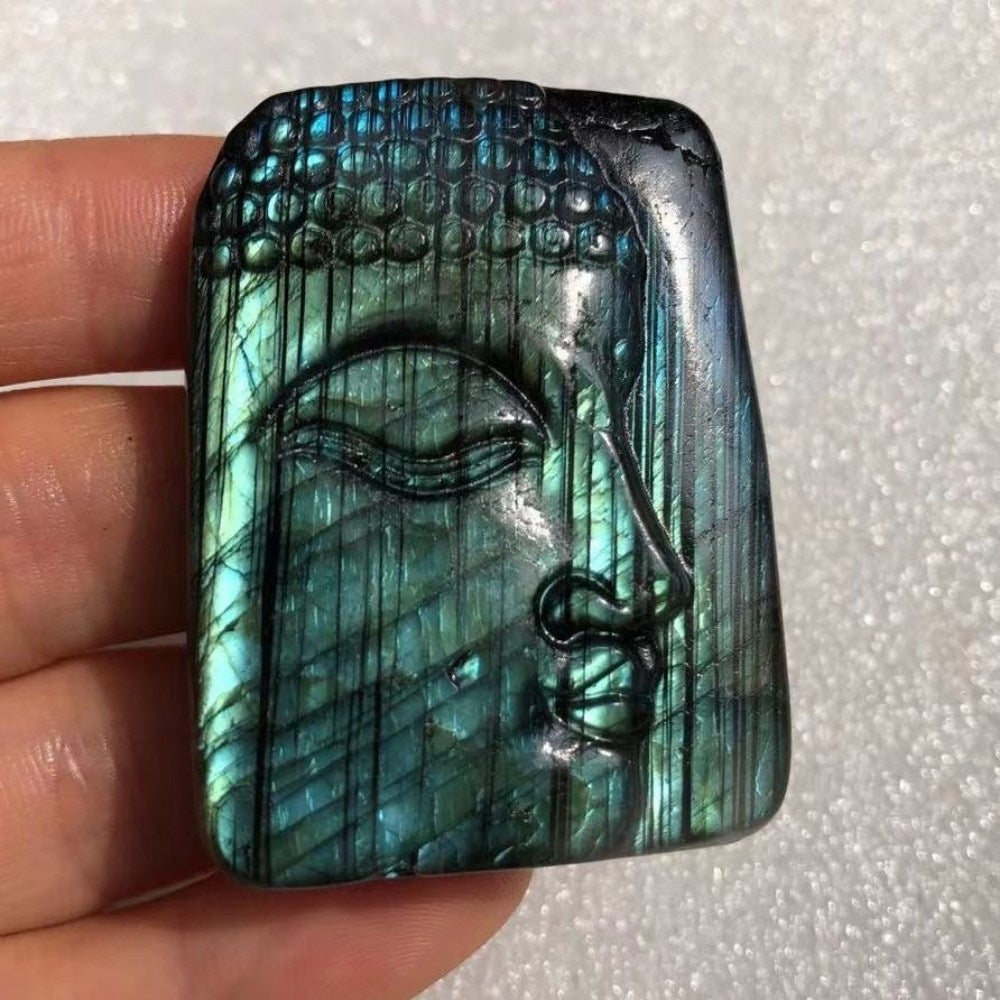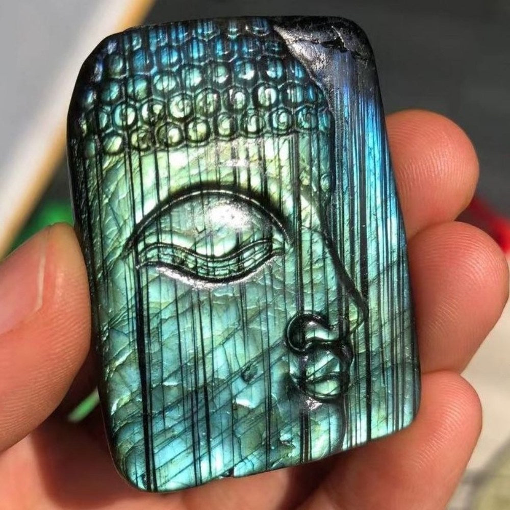 The Buddha image, representing enlightenment, oneness, and peace, merges with the mysticism and beauty of the labradorite, creating a strong meaning within an authentic piece of art!