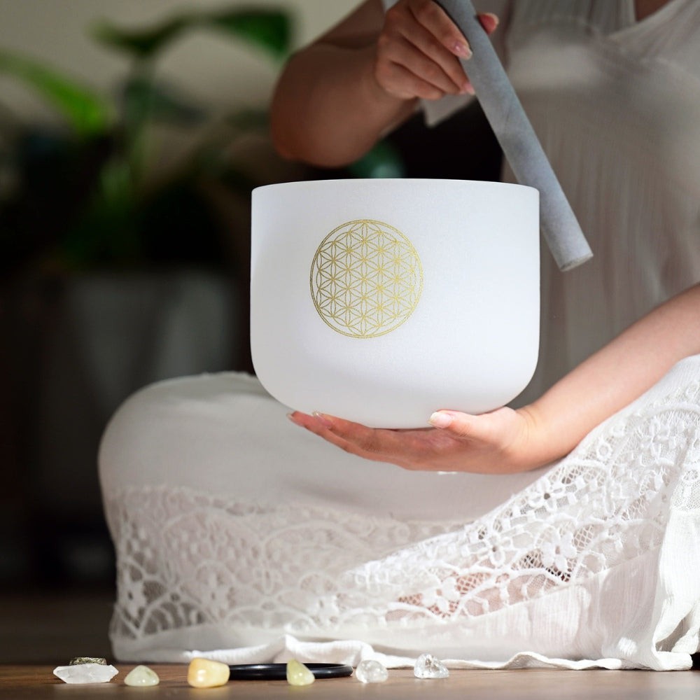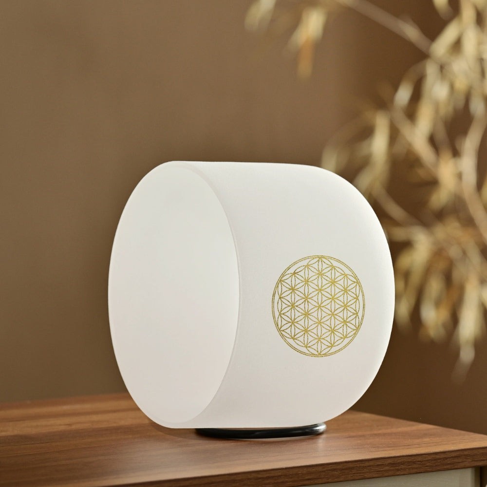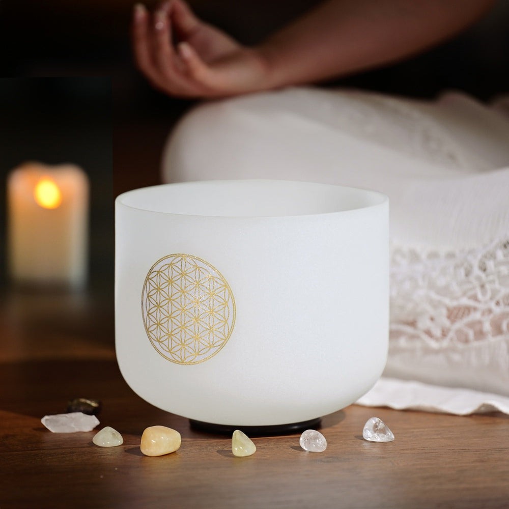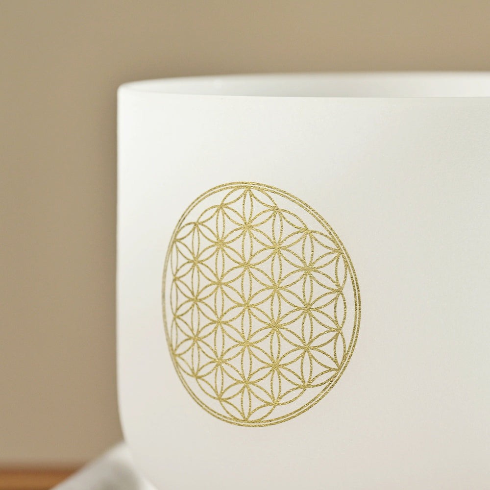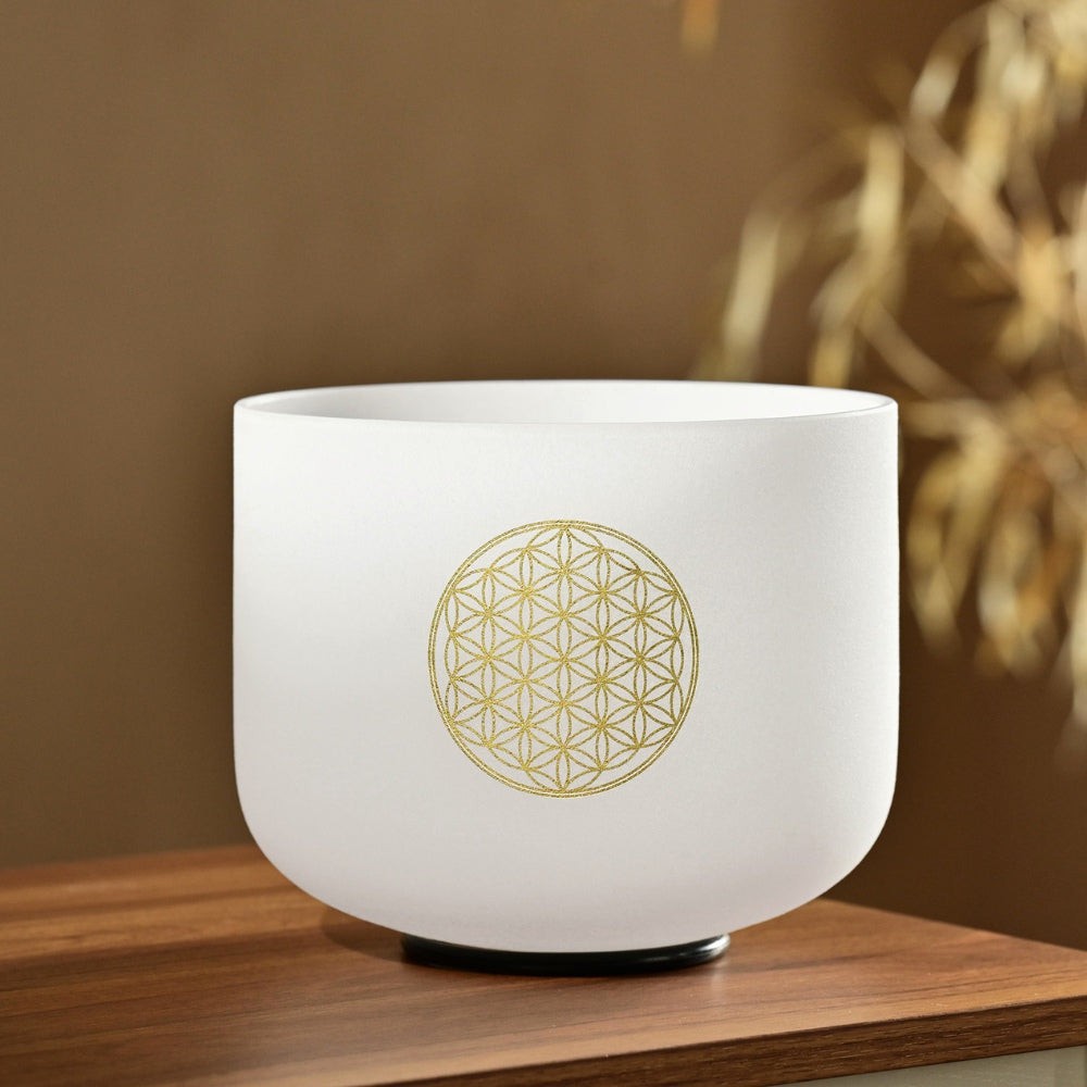 Our Crystal Singing Bowl, adorned with the sacred Flower of Life pattern, combines the timeless wisdom of sacred geometry with the ethereal purity of quartz crystal.