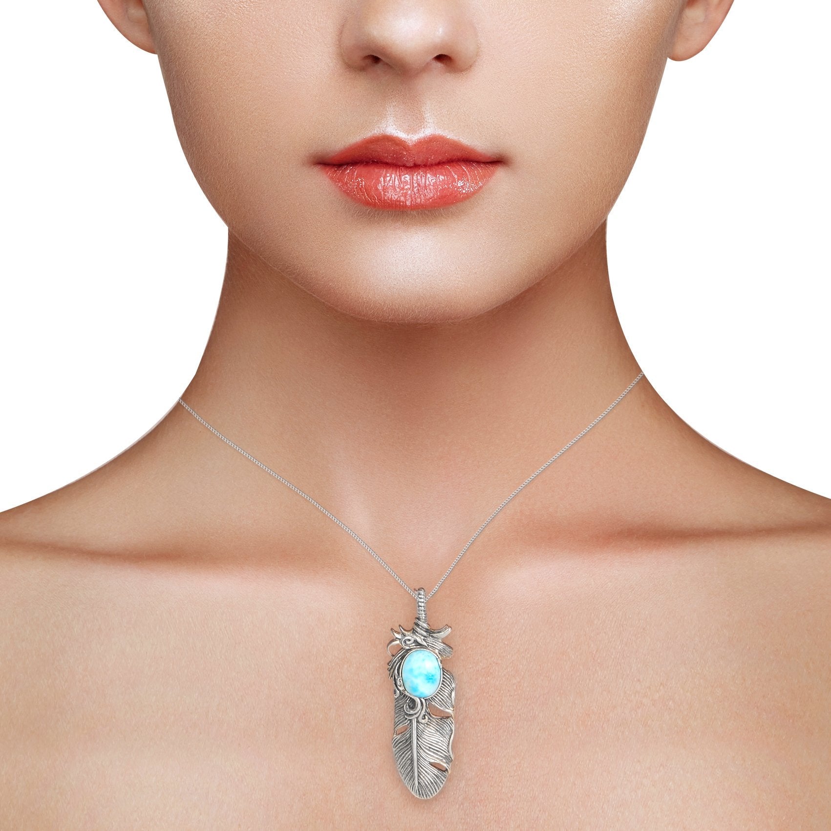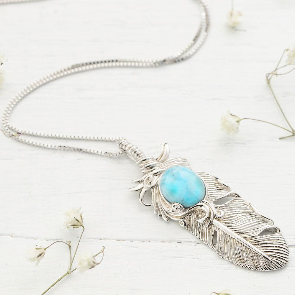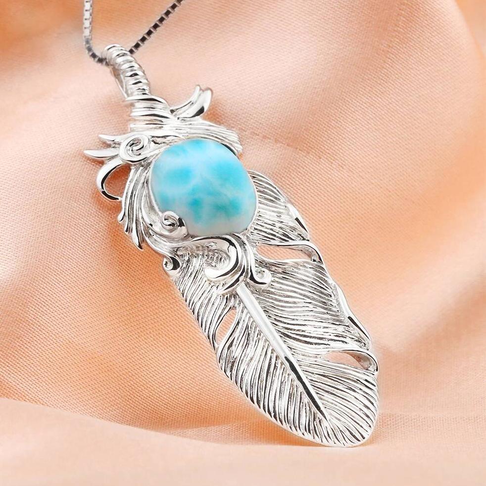 The enchanting beauty of the skies and the mysteries of the sea are perfectly captured in this stunning Feather Necklace - Crystal Larimar Pendant. Accented with a cushion-cut Larimar gemstone this necklace will surely make a lasting impression. Classic, timeless, yet so unique, just like you.