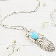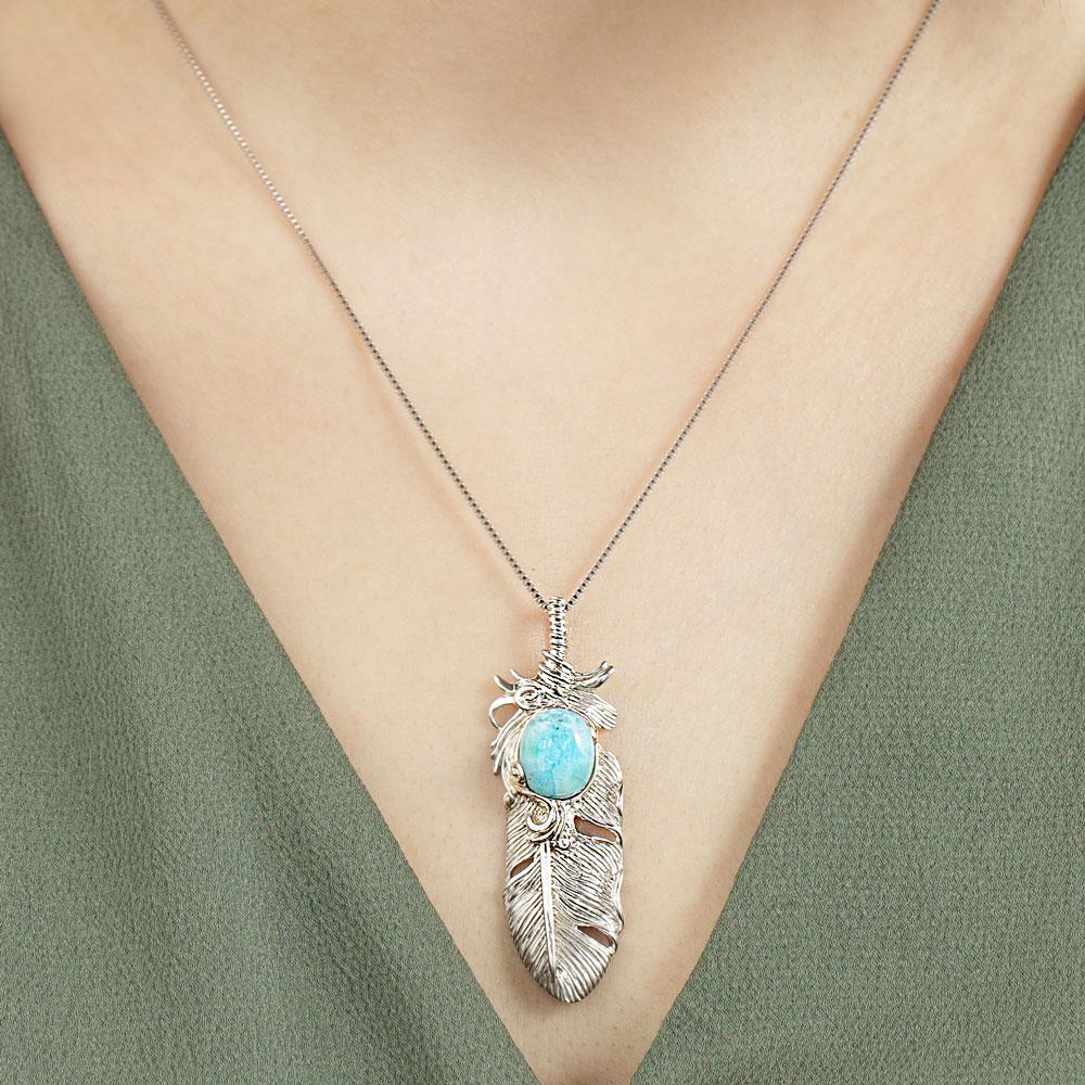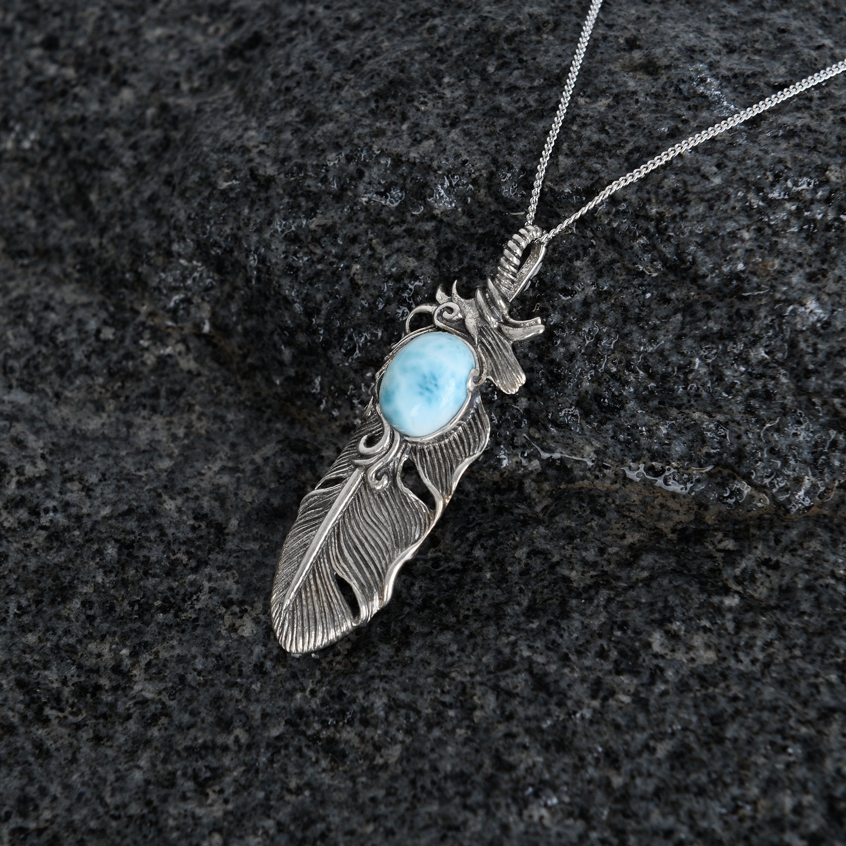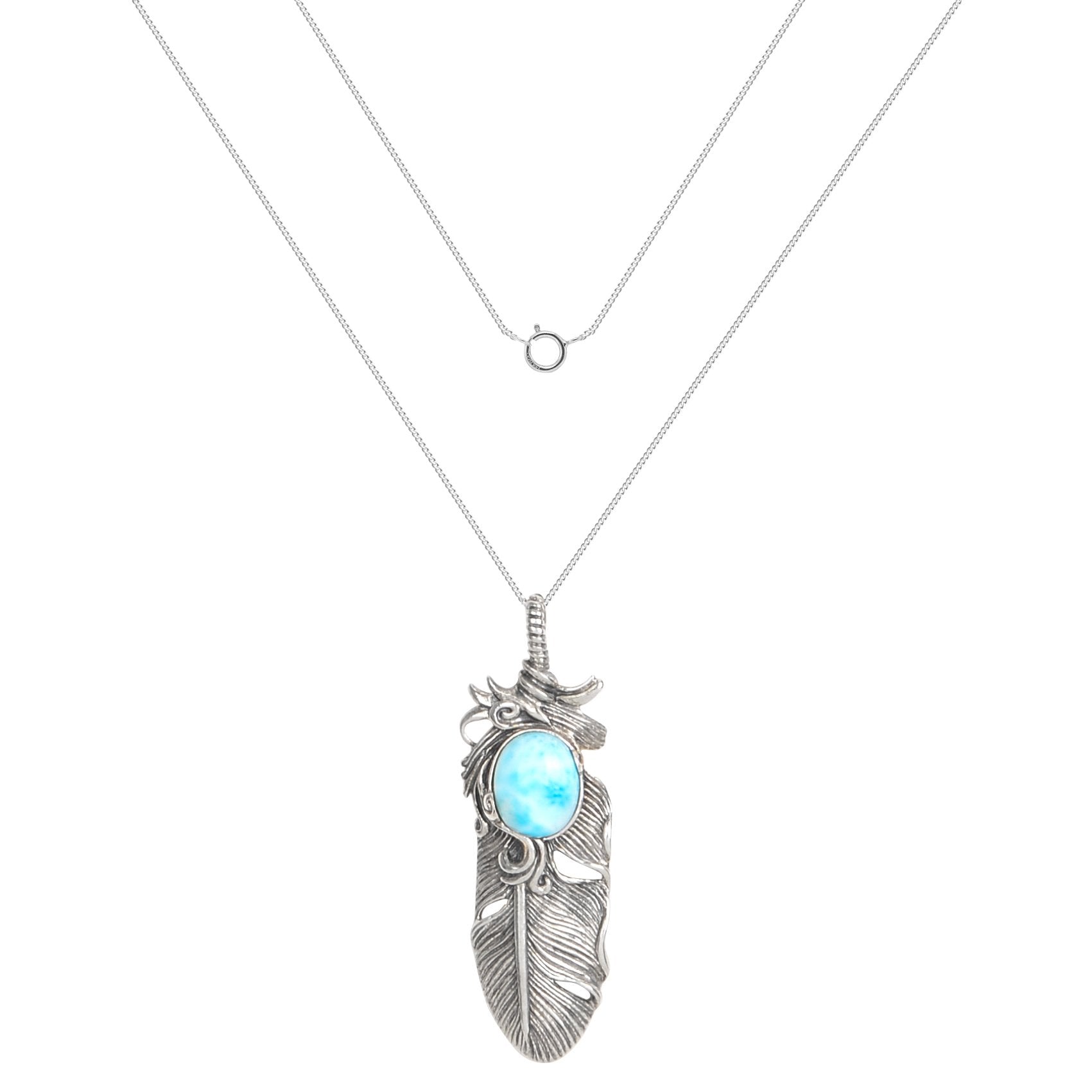The enchanting beauty of the skies and the mysteries of the sea are perfectly captured in this stunning Feather Necklace - Crystal Larimar Pendant. Accented with a cushion-cut Larimar gemstone this necklace will surely make a lasting impression. Classic, timeless, yet so unique, just like you.