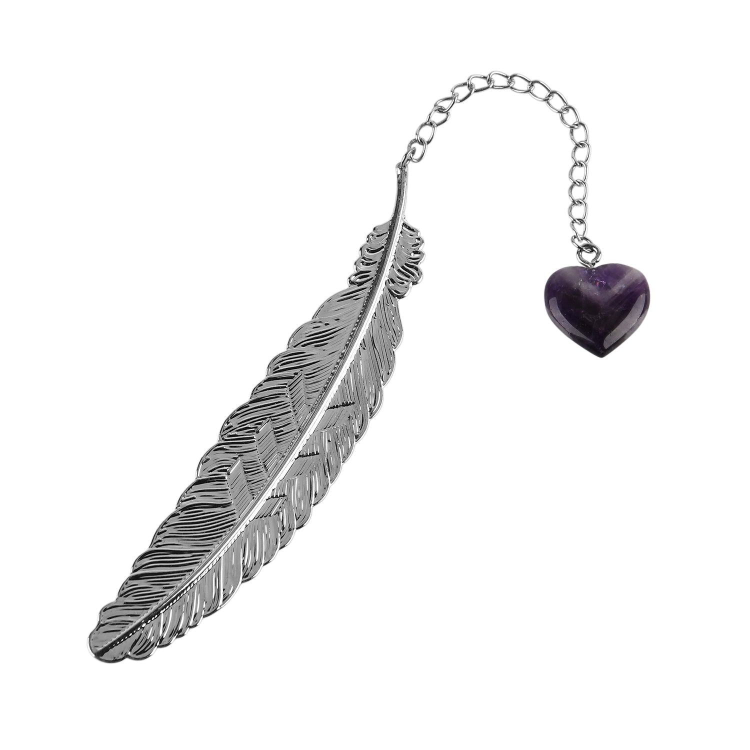 Feather Bookmark – Alloy feather with heart-shaped amethyst chain, 11.5 × 2.5 cm (4.52 × 0.98 in), 10 g