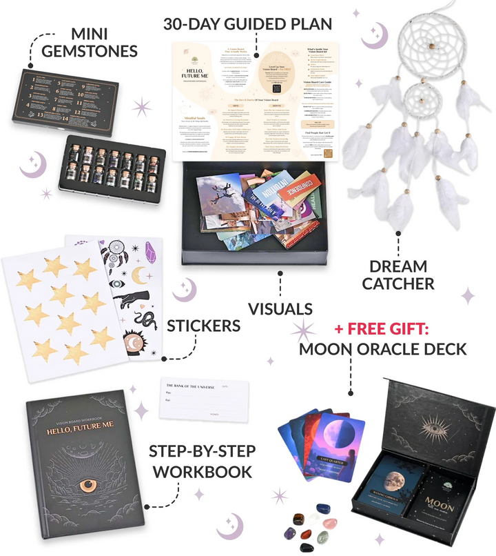 All you need to make your vision board is in this kit. From science-backed visuals that tap into your subconscious, to a big vision board poster inspired by Feng Shui principles. - Bonus Gift: Moon Oracle Deck