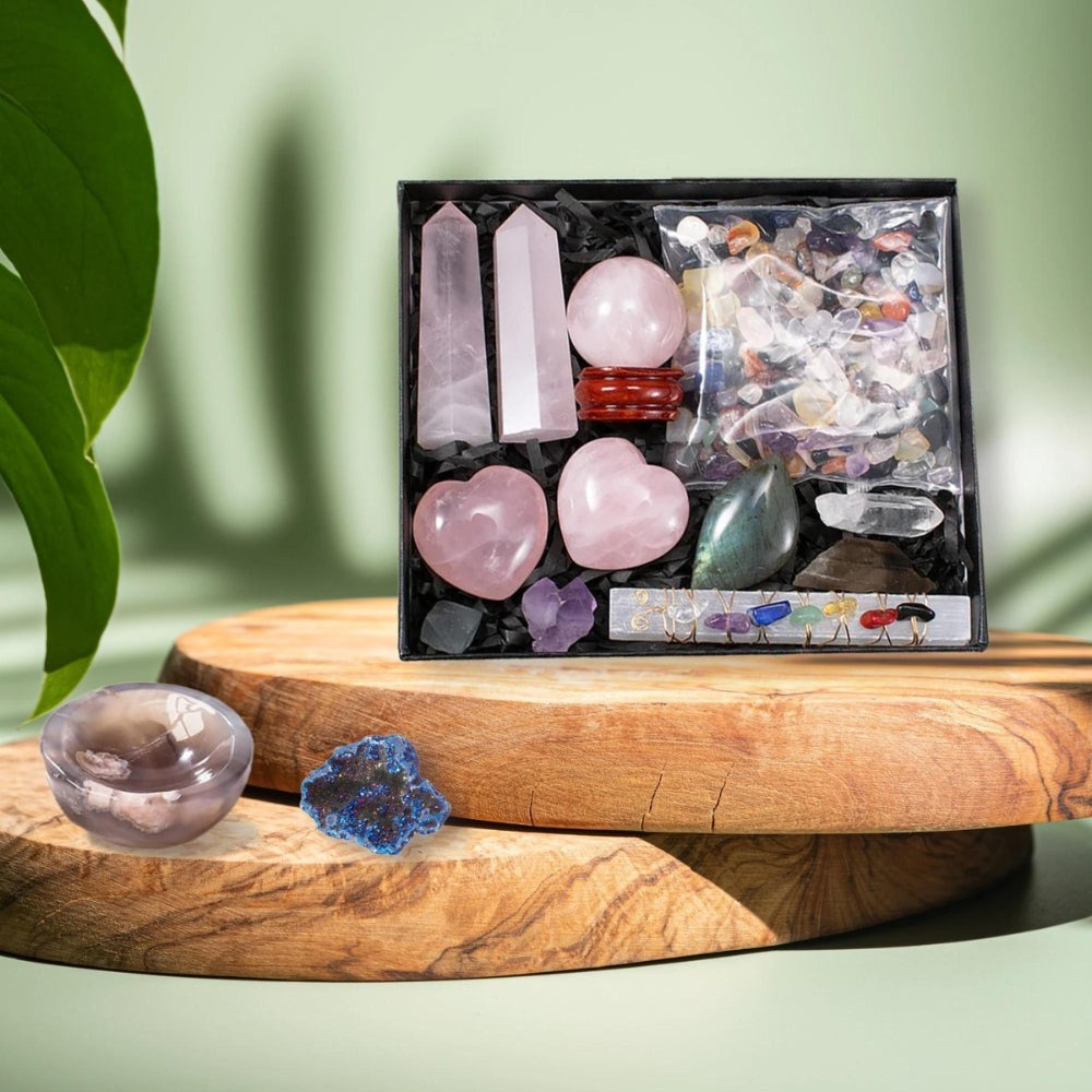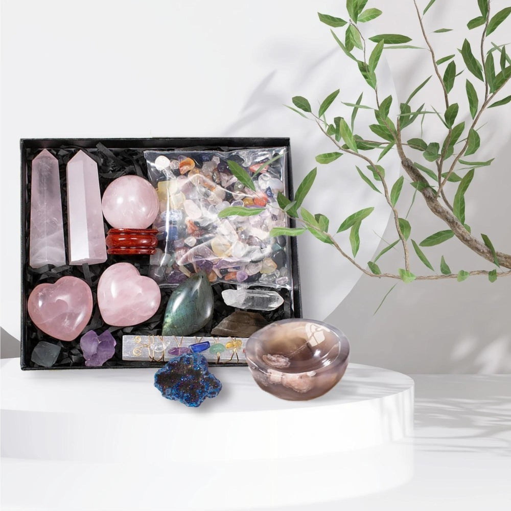 Bundle includes: Rose Quartz Love Energy Crystal Set, Sakura Flower Agate Crystal Bowl, Rainbow Titanium Quartz Crystal