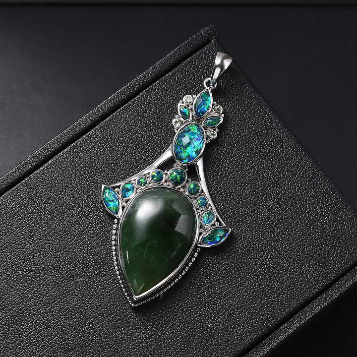 This Sajen pendant features nephrite jade as its centerpiece, framed by colorful gemstones. Nephrite jade has long been valued for wisdom and protective energy, while the Sajen design reflects cultural artistry and spiritual expression. Without a chain, it offers versatility while carrying deep symbolic meaning.