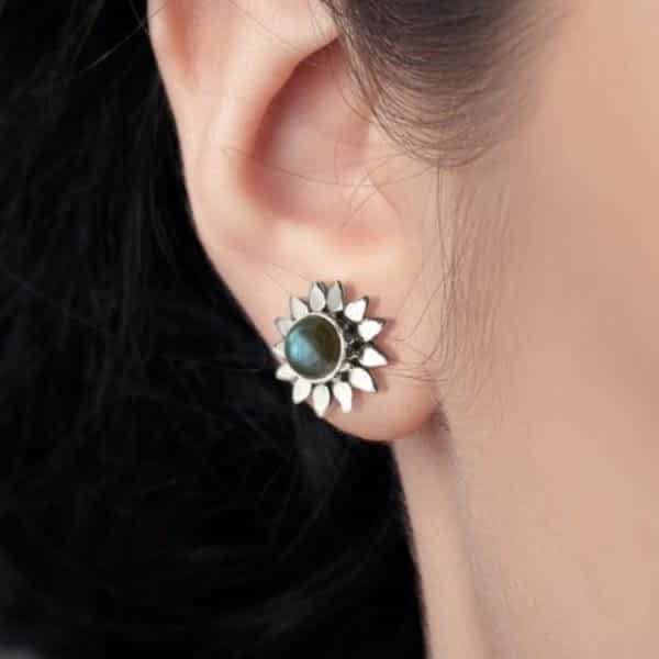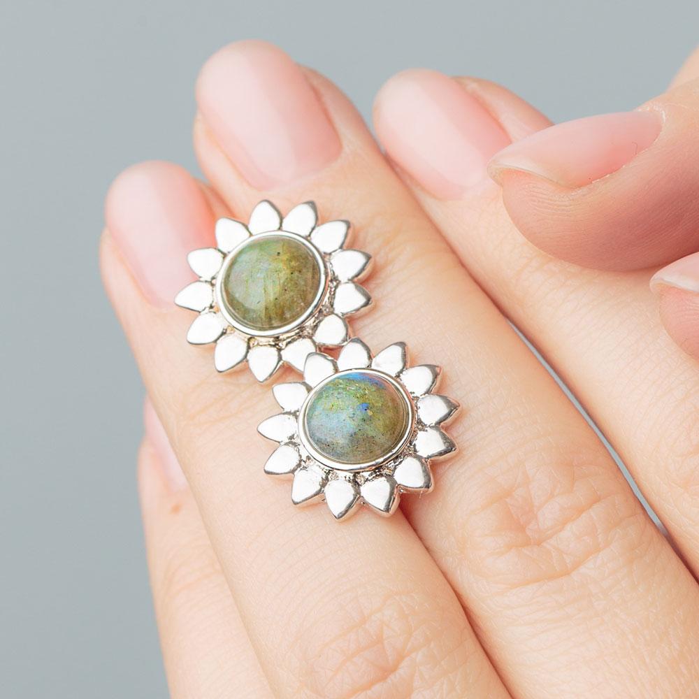These beautiful silver and Labradorite Earrings resemble the shape of a sunflower. These beautiful plants symbolize long life, good fortune, and vitality.