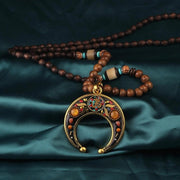Let the crescent moon rise from within you and gift you with deeper spirituality. Below the lovely wooden beads, the suspended crescent moon holds one of the most sacred and powerful symbols - the OM.
