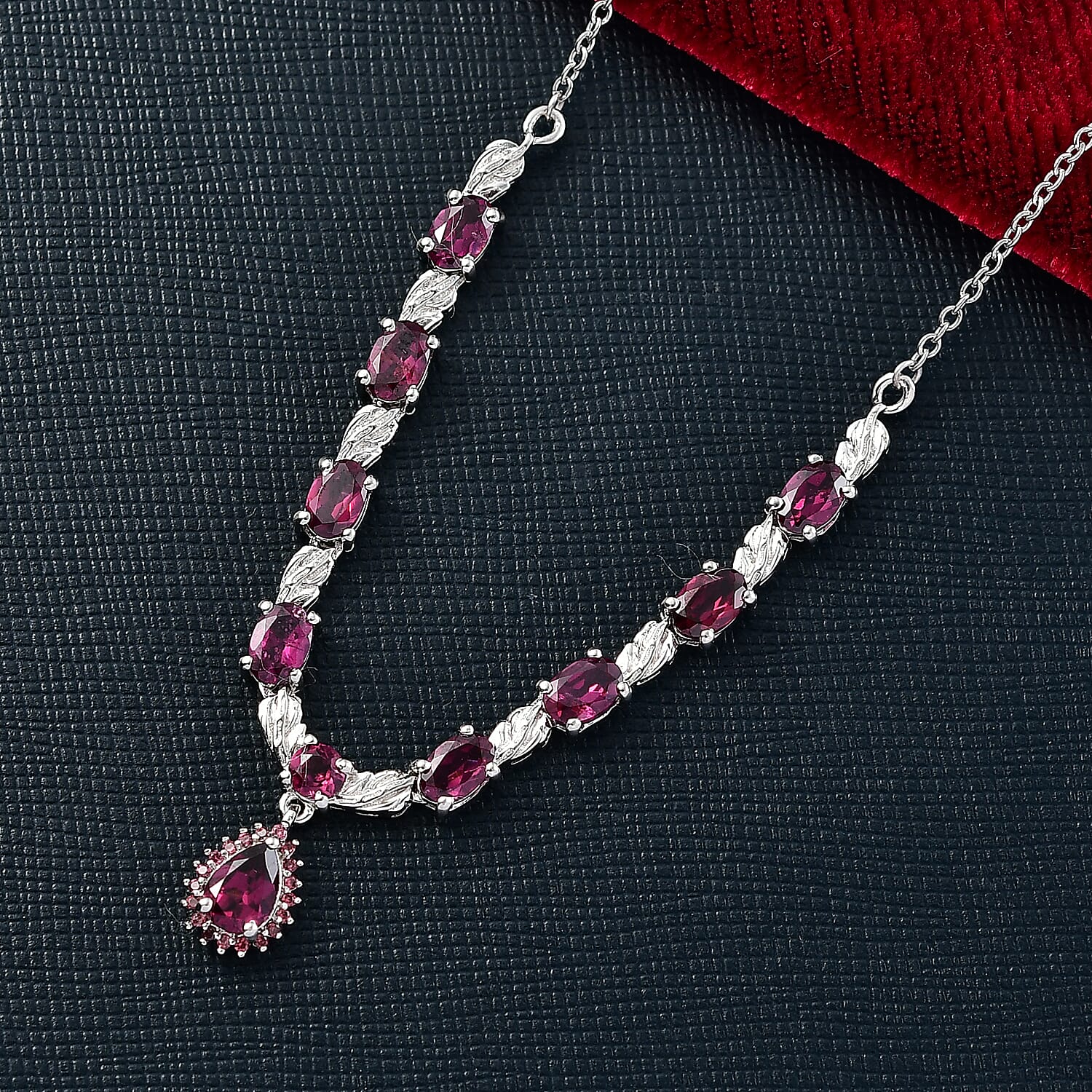 Let your presence glow with the Twilight Leaf Glow Orissa Rhodolite Garnet Necklace, a graceful design that blends natural beauty with refined simplicity. Featuring purplish-red Orissa rhodolite garnets associated with emotional strength and heartfelt connection, this piece brings warmth and depth to your look. Finished in platinum bond over durable stainless steel, it offers a sleek, luminous glow that feels effortless for everyday wear while remaining elegant enough for special moments.
