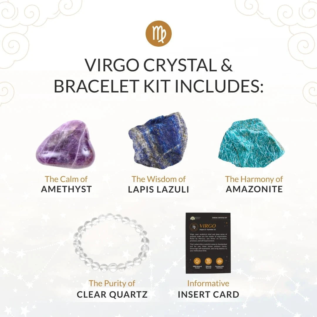 The Virgo Crystal Bundle is crafted to support your analytical mind, enhance intuition, and promote a sense of calm. Whether you're seeking mental clarity, emotional balance, or spiritual connection, this bundle will guide you toward your highest potential.